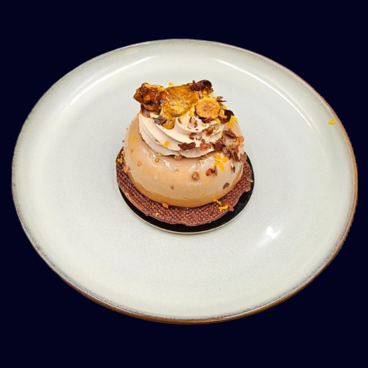 Mousse Gianduja ( chocolat au lait noisette), cœur mandarine, sur biscuit pain de gène