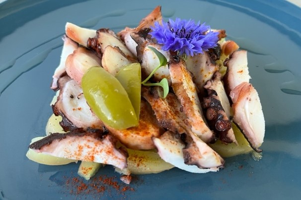 Tranches de poulpe a la plancha aux épices, posé sur des pommes de terres a l’espagnole