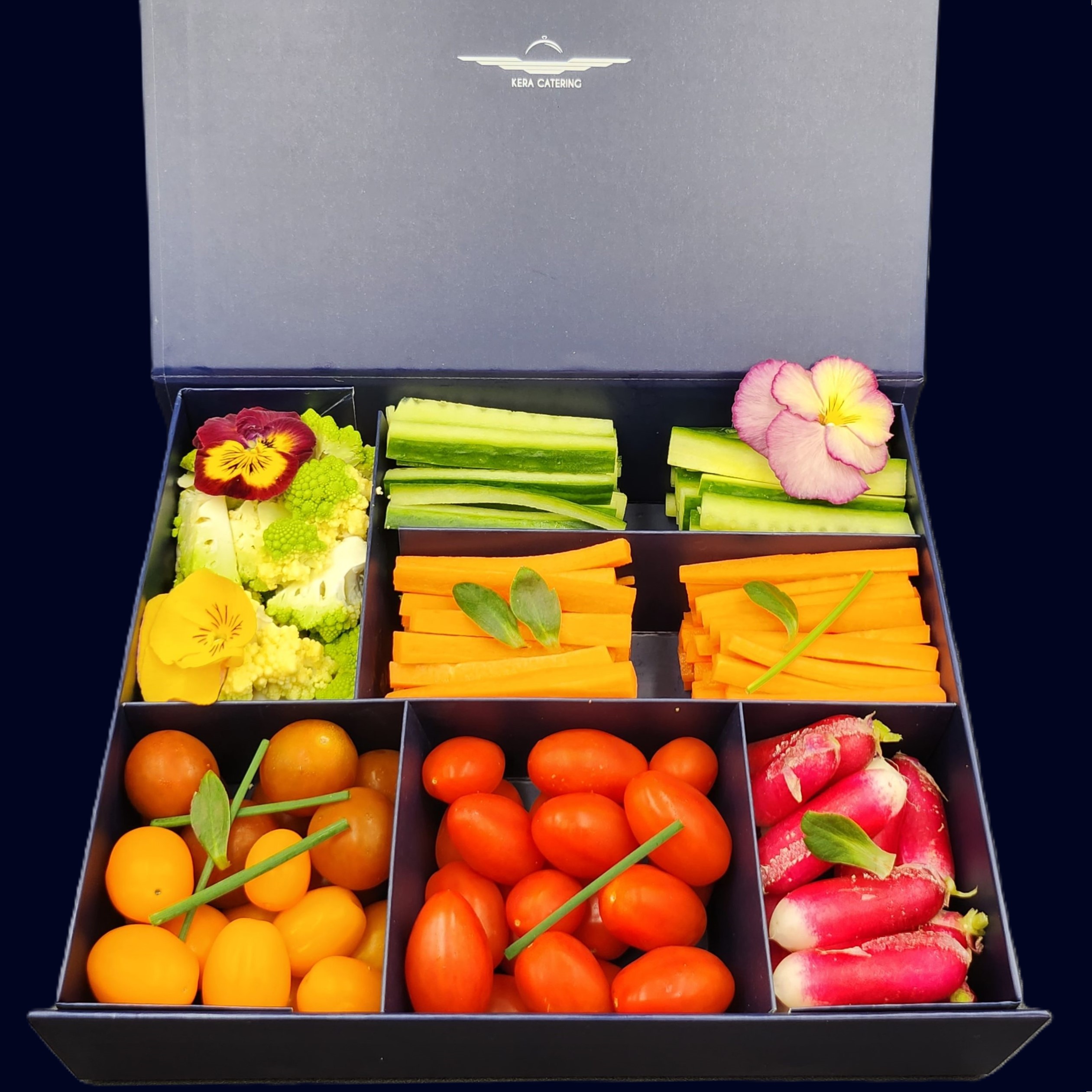 A platter of raw vegetables (radishes, carrots, cucumbers, purple cauliflower, cherry tomatoes) and its lime and chives.