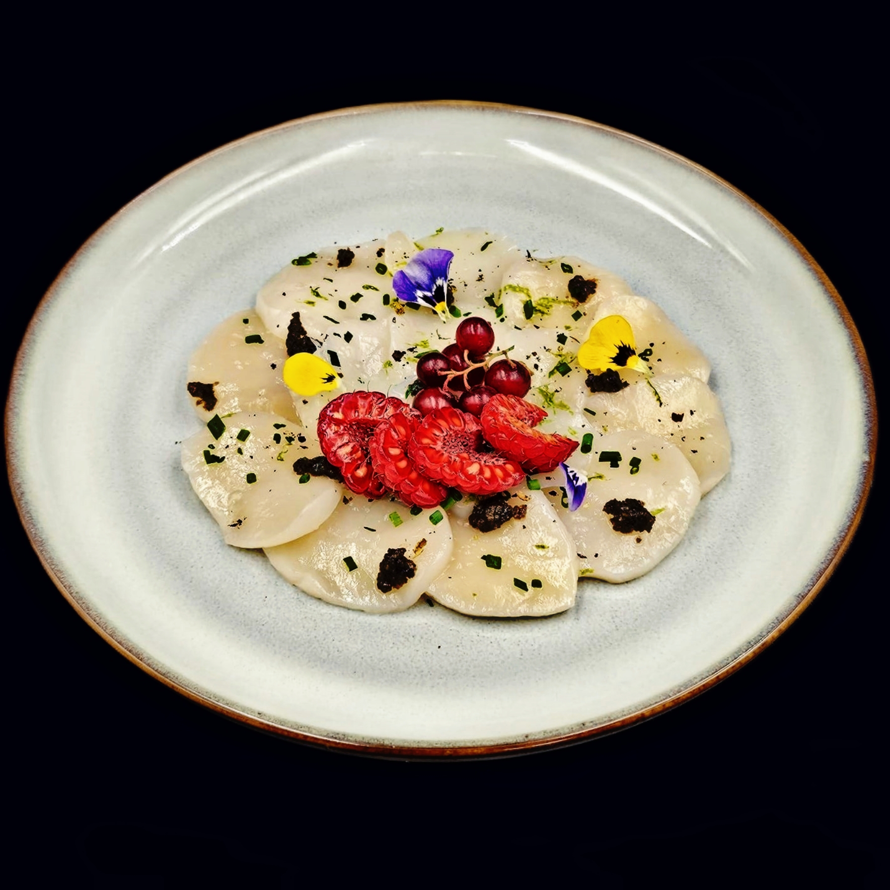 Fines tranches de St Jacques avec huile d’olive, citron, Yuzu et éclats de fruits rouges.