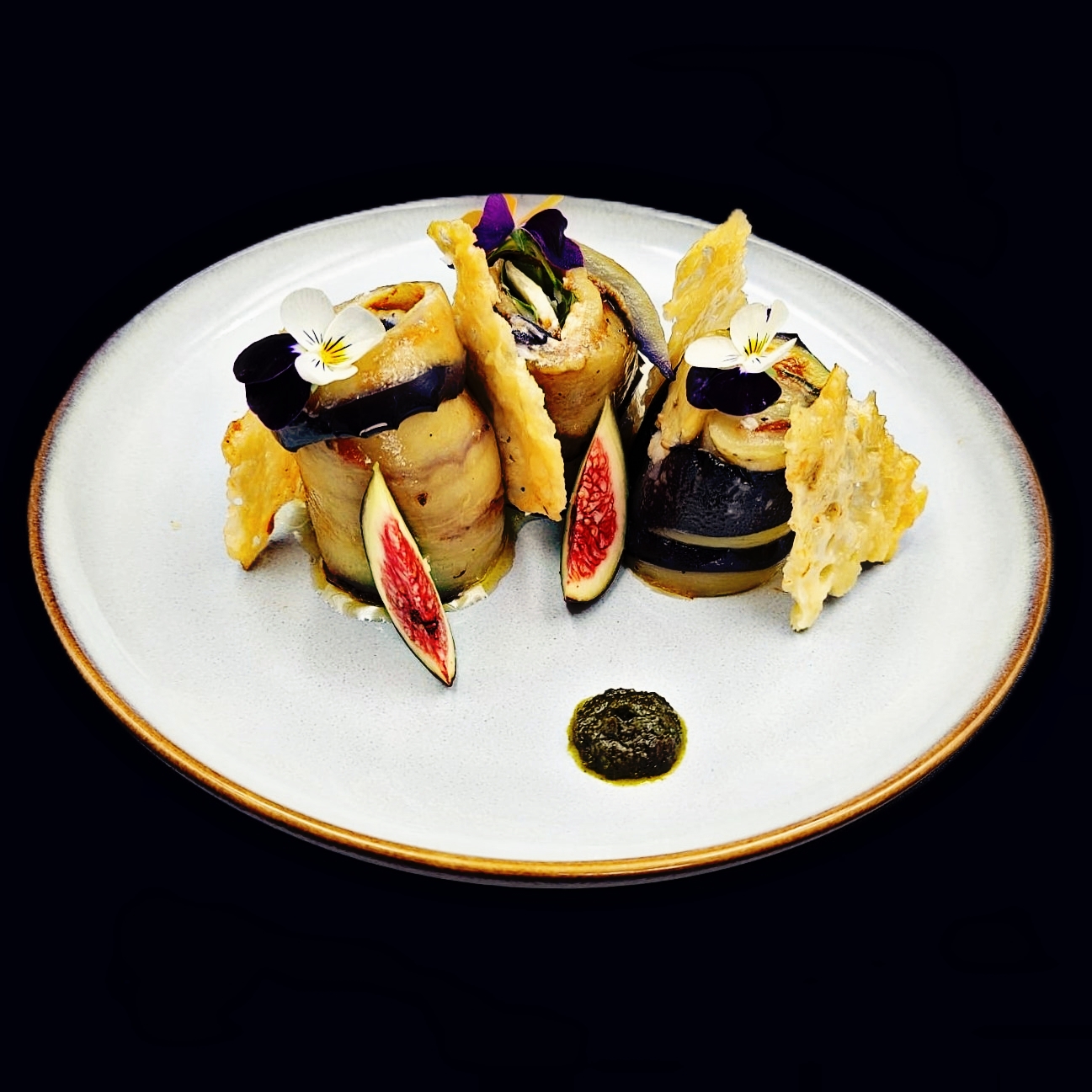 Eggplant roll with Italian tomato sauce, fresh basil, homemade parmesan chips.