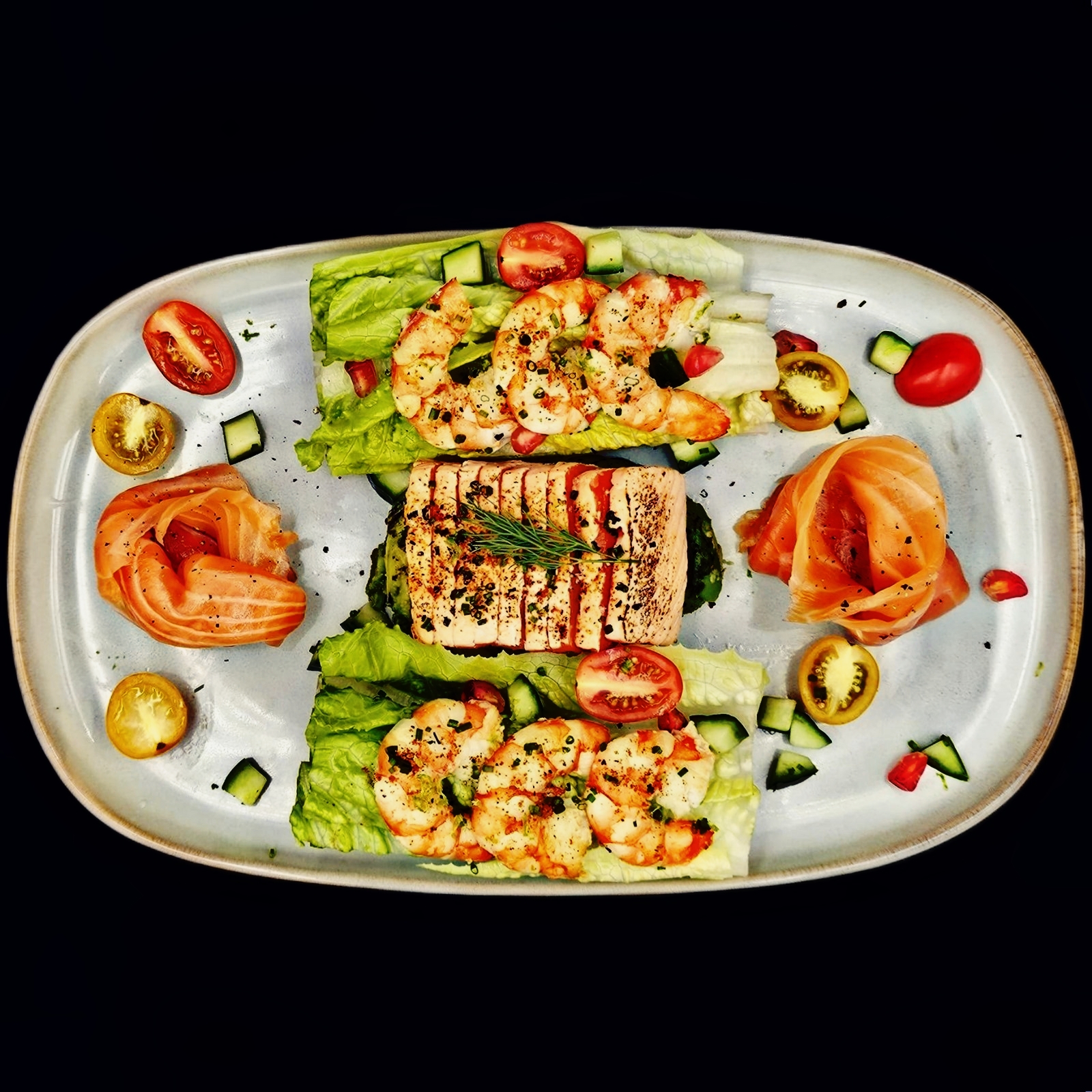 A purely Brazilian creation, Flashed Avocado garnished with slices of poached salmon, lettuce, prawns, cherry tomatoes, Scottish salmon.