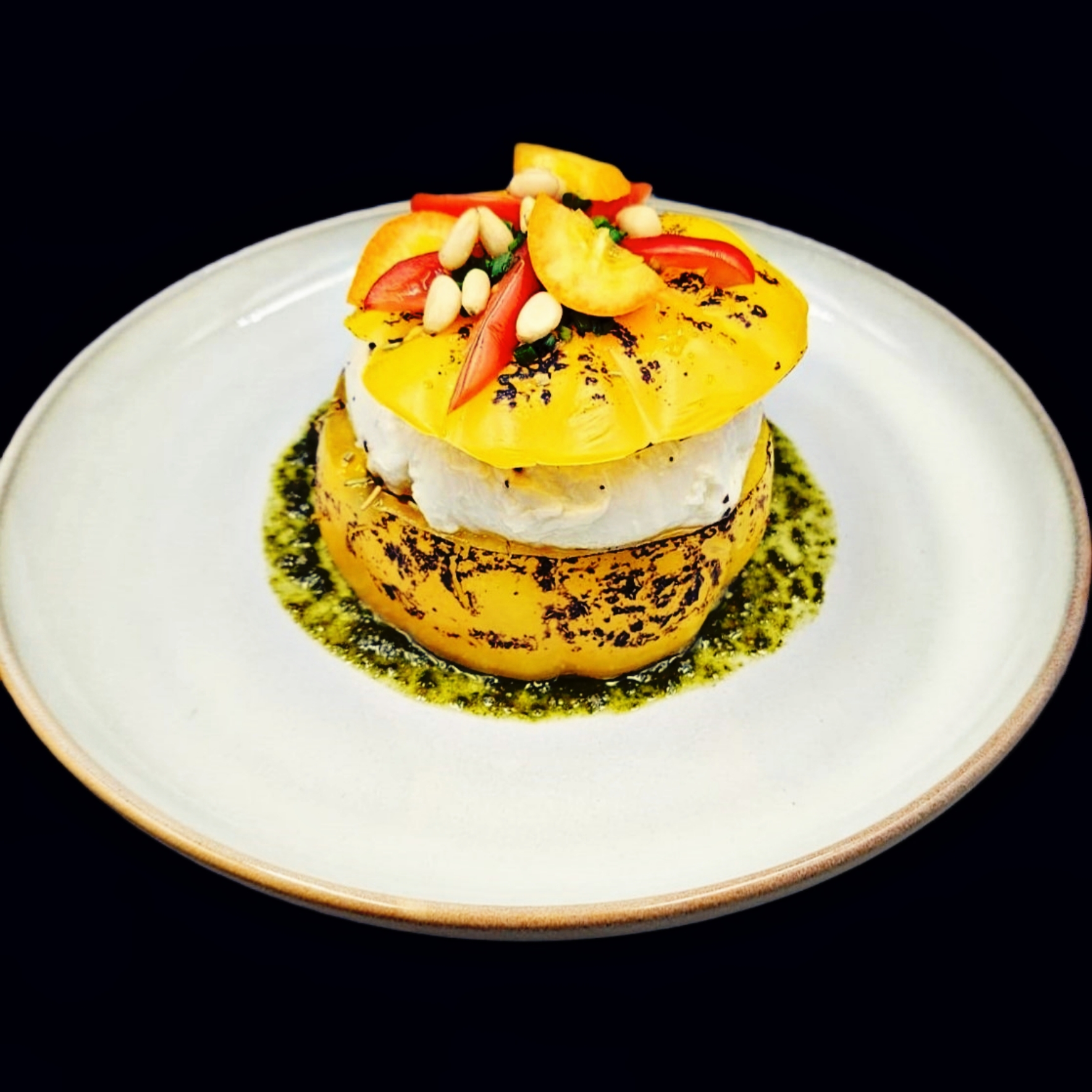 Burrata Di Bufala. Sauce vinaigre de tomates, pesto et basilic.