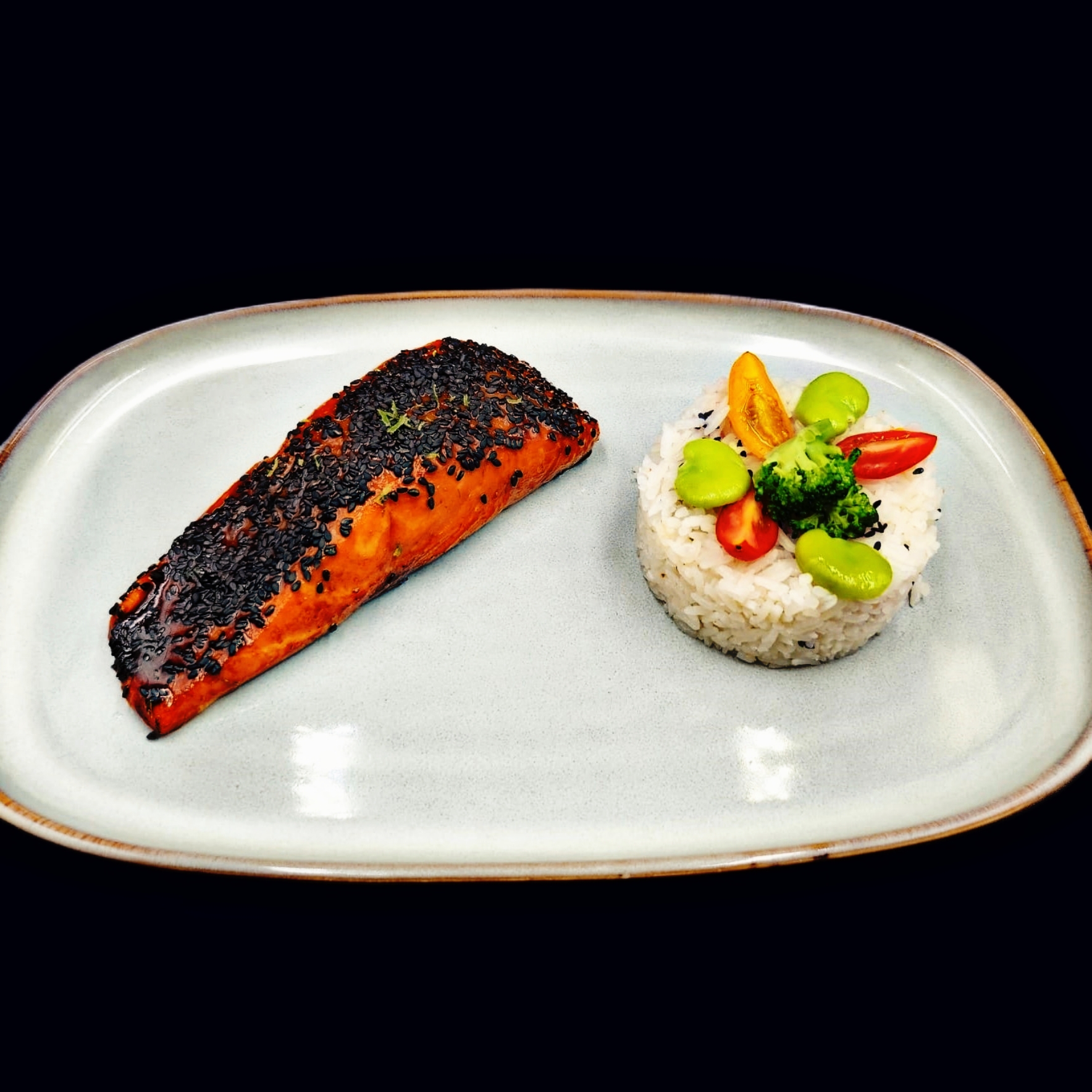 Pavé de saumon et sa pate de miso sauce soja, gingembre, citronnelle enrobé de graines de sésame.