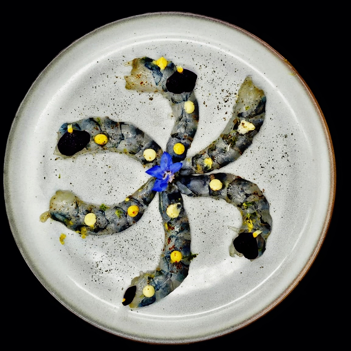 Carpaccio de crevette, l’huile d’olive citron et zeste de citron.