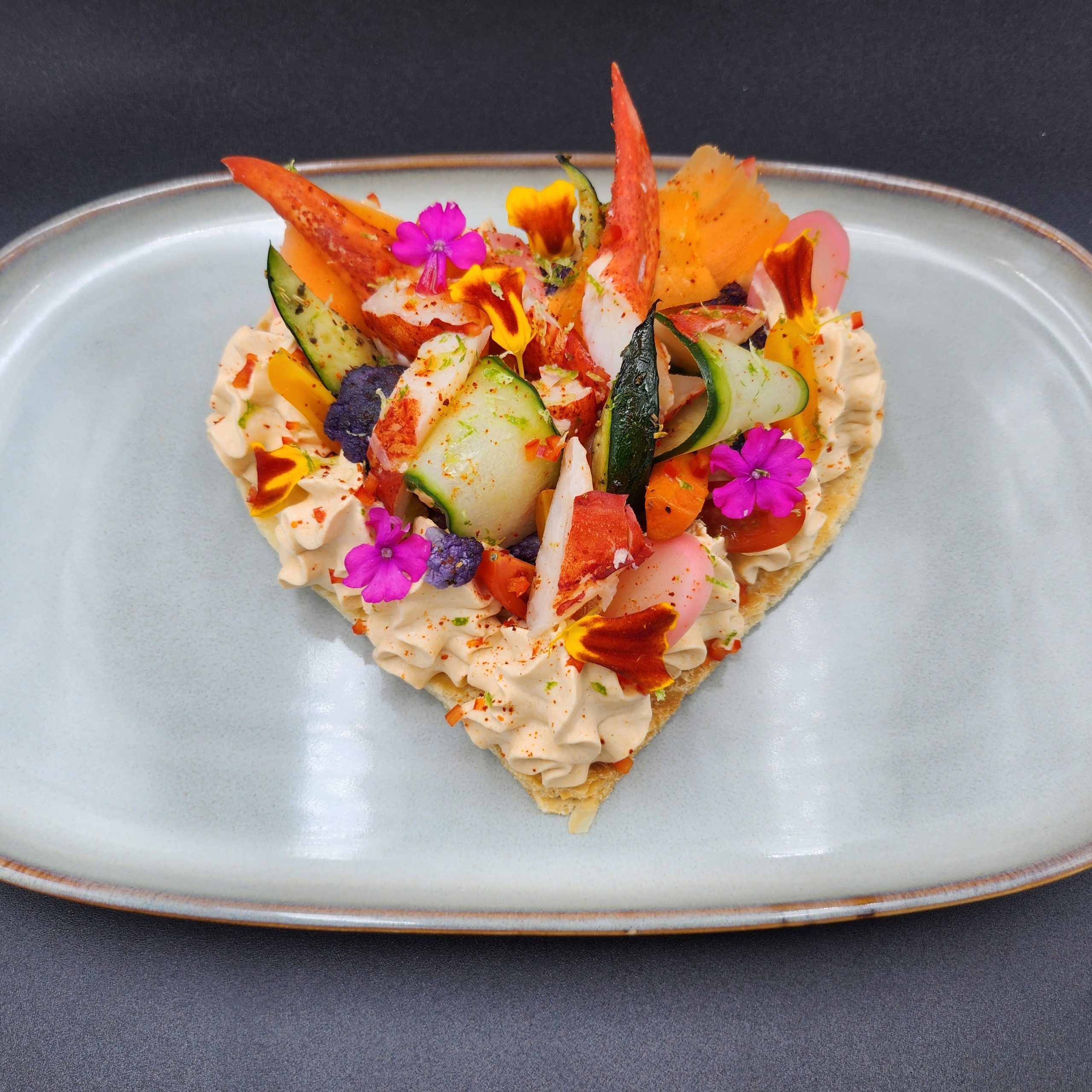 Socle en feuilleté, avec crème bisque de homard, mixte de légumes croquants avec du homard…